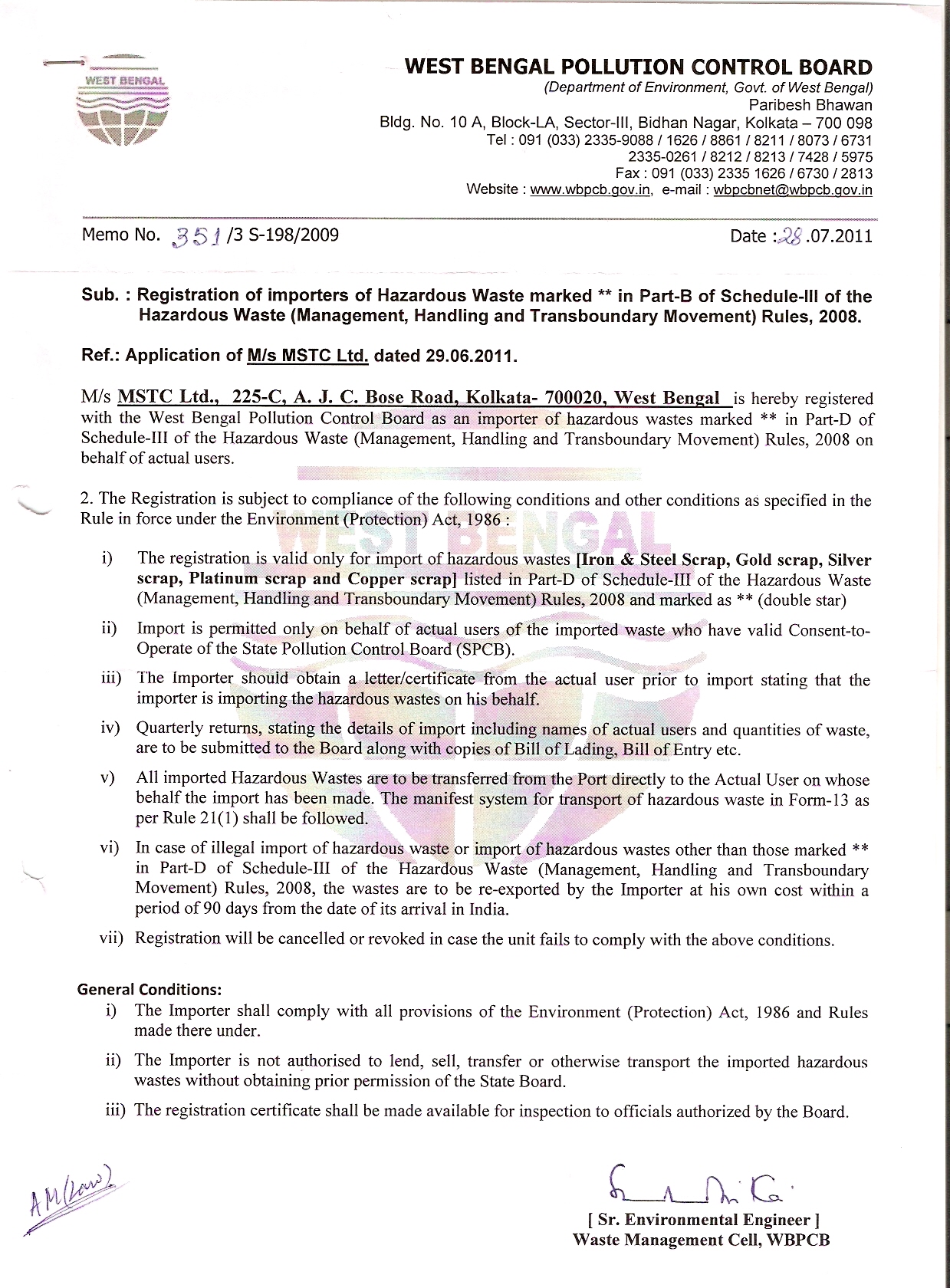 This is to notify that MSTC Ltd. has been registered as importer of Hazardous Waste on behalf of actual user by West Bengal Pollution Control Board vide "Memo No. 351/3 S-198/2009 dated 28.07.2011" for import of following wastes:
